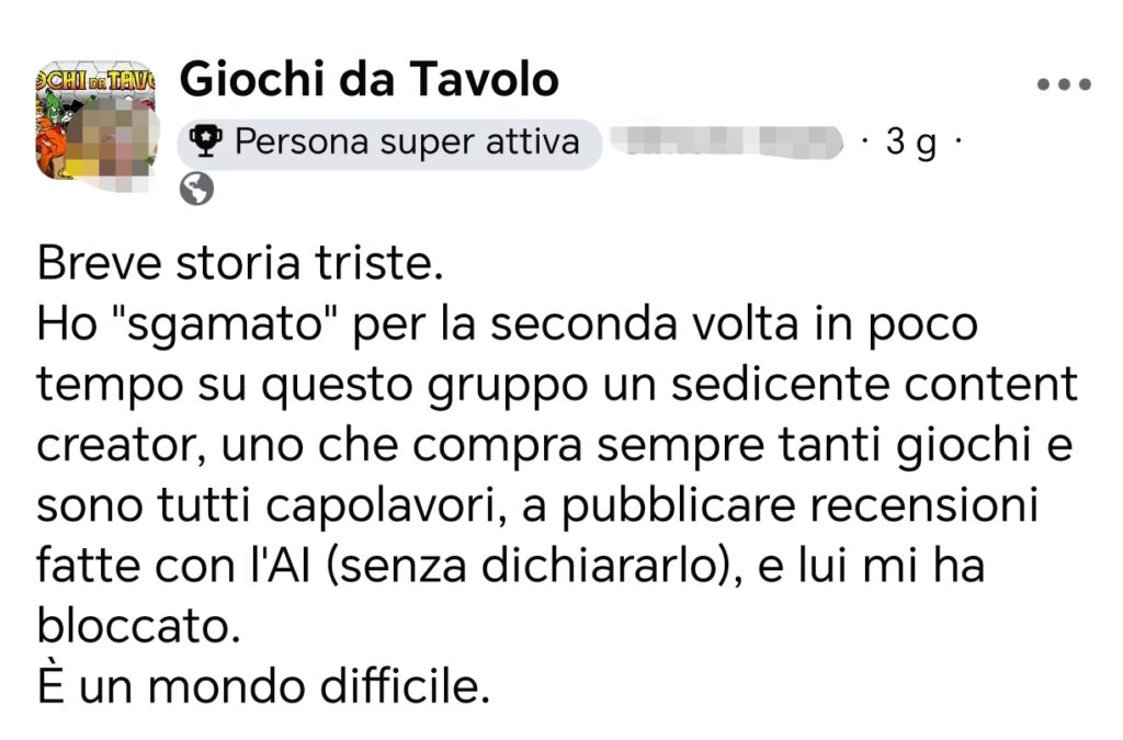 La persona attaccata nel post, senza essere stata nominata dall’autore, è abbastanza palese a chi bazzica l’ambiente social dedicato al mondo del gioco da tavolo. Una persona che ho conosciuto di sfuggita a Play, con cui ho scambiato due chiacchiere dal vivo e dietro lo schermo. Persona simpatica e appassionata.